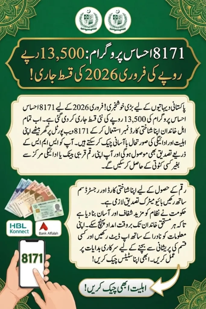 The most significant news for March 2026 is the launch of the new Rs. 13,500 installment under the 8171 Ehsaas Program. Families who are already enroll can now easily check their payment status online using their CNIC on the 8171 web portal. In just a few simple steps, you can find out if your payment has been process and learn which payment center or bank branch is available for you to collect your funds.