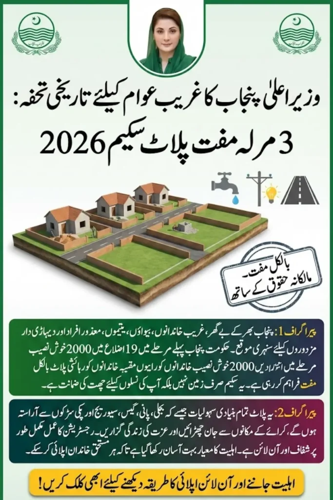 Punjab 3 Marla Plot Scheme 2026 launched by Chief Minister Maryam Nawaz is a major housing initiative for low-income and landless families. Under this project, free 3 Marla residential plots approved by the government will be provided to widows, orphans, disabled persons, daily wage earners and homeless citizens in 19 districts. The process is completely transparent to ensure that only deserving families benefit.